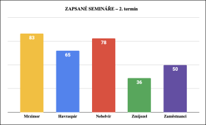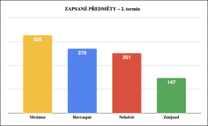 Výuka ve druhém termínu začala konečně vypadat zajímavěji než v tom prvním. Pro profesory totiž znamenala první termín povinných oprav, což výrazně zamíchalo s pořadím v bodování. Přesto se potvrdilo mnoho prognóz z prvního termínu – třeba ta, že Mrzimor si letos jde pro školní pohár. To dokazují nejenom změny v počtech přihlášených předmětů.