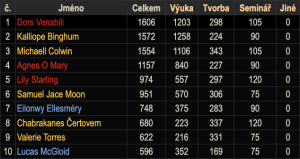 Velmi zajímavý je vývoj v počtu přihlášených předmětů mezi adepty na snaživce. Zatímco Kalliope Binghum si zapsala dalších pět tříd a dostala se na celkový počet 42 předmětů, Thalira Arannis svůj boj vzdala a 15 tříd si odhlásila, dostala se tak na příjemné číslo 8. Síly nedochází ani Michaellu Colwinovi, který jeden předmět přidal a momentálně jich studuje 35. Pomalu, ale jistě také bodově nahoru vystřelila Dors Venabili, která si připsala tříd 11 a momentálně se věnuje celkem 28 různým oborům. V hledáčku mám však stále i další nadějné bodohrotiče, třeba Agnes O Mary, Austina Matthewa Hardmana či Samuela Jace Moona, kteří mají všichni tři shodně po 23 třídách.