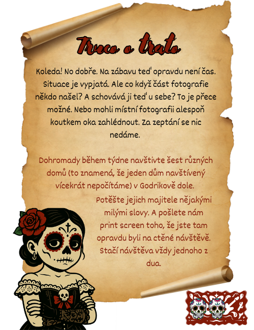 Víš, že je nesmírně důležité přinést chybějící kousek i další části fotografie zpět a dát je dohromady. Hlavou ti běží slova Dámy: „Kdyby nebylo vzpomínek a fotky, ani po svíčkách nedorazí naši mrtví na tyto oslavy. Volání by nebylo tak silné. A pak? Pak by zanikl i jejich poslední kousek duše, který v tomto světě je.“ S jasným cílem se ženeš kupředu, aniž bys věděl nebo vůbec viděl kam. Nevíš, kudy se dát, nevidíš na krok a v tom zmatku tě až po hodné chvíli napadne použít hůlku. Respektive to napadne tvého parťáka, ty jsi až moc rozrušený ze ztráty kousku fotografie kolejních duchů. Co když ji nenajdeš a oni pak nikdy nenajdou cestu zpět?