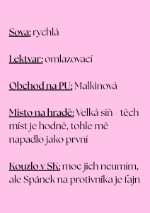Čtenářům, a vlastně celému hradu, bych chtěla popřát, ať se daří, ať je nám tu spolu dobře. Hlavně na sebe buďte hodní.