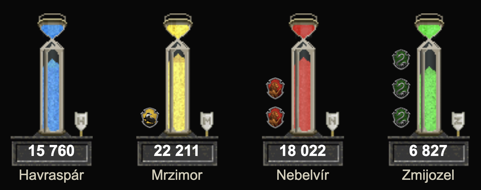 Že boj o pohár vede Mrzimor, to asi nikoho nepřekvapí. Zajímavé však je, že svůj náskok na Nebelvír zvýšil jen o trochu – na konci 2. termínu mezi kolejemi bylo 2 500 bodů, nyní je to zhruba 4 000. To Zmijozel si v klidu útočí na hranici 7 000 bodů a vůbec neřeší, co se děje u ostatních.