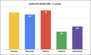 Troufám si tvrdit, že ani další termín nepřinesl v seminářích žádný velký zvrat. Všichni s výjimkou Zmijozelu se věnují doplňkové výuce ve velkém a rozdíly mezi přihlášenými semináři jsou prakticky zanedbatelné, obzvlášť vzhledem k absenci bonusových bodů a naší neznalosti míry využívání Moudrého klobouku. Zelení se nechávají i nadále válcovat fialovými, což je pro Ferdinanda určitě velkým utrpením.