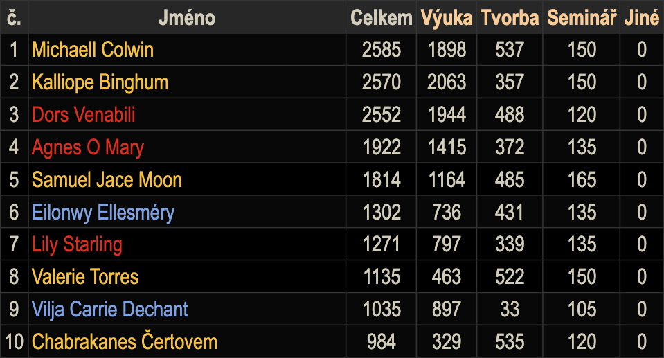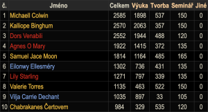 Počty předmětů však nejsou jediným rozhodujícím kritériem pro nejvyšší počet bodů. Michaell na konci termínu předběhl Kalliope i Dors a postavil se do čela žebříčku – především díky tomu, že se ve větší míře věnuje oblasti tvorby.