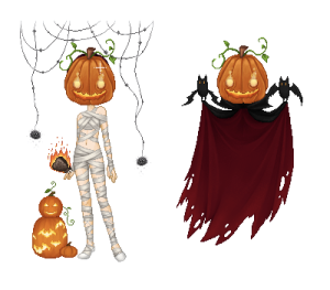 První modelkou je zmijozelská primuska, která se omotala od krku až k patě bílými obvazy. Kolik jich na takový outfit, aby skryl vše, co má, muselo padnout, těžko říct. Outfit à la mumie doplnila slečna Enola oranžovými doplňky v podobě svítící dýně vedle postavy a samozřejmě dýňovou přilbou. Skvělým detailem je i hořící brambor náramek.