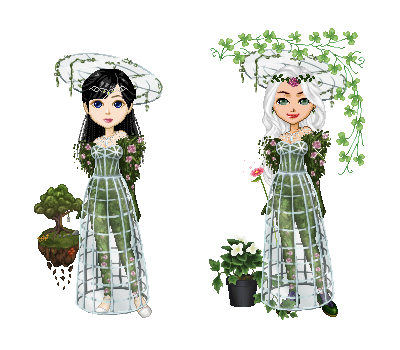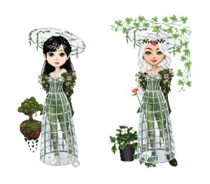 Jak si můžete všimnout u první modelky, k těmto šatům není třeba příliš doplňků, protože samy o sobě přitáhnou veškerou pozornost. Eleanor však zvolila naprosto skvěle šperky, které krásu skleníku podtrhly a ladí dokonale. Stříbrná čelenka a náhrdelník s maličkým zeleným detailem v podobě kamínku. Skvělá a efektivní volba. Vedle sebe nechala levitovat Kousek lesa, kterým se může pyšnit pouze část obyvatel.