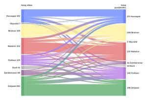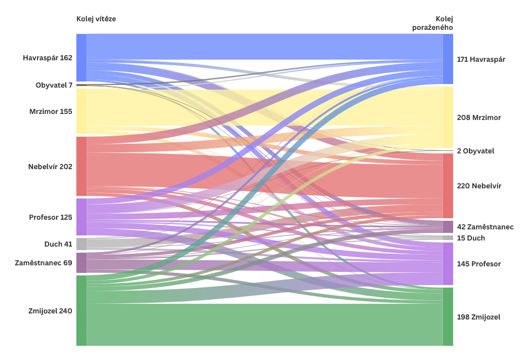 Vraťme se ale zpět k datům. Očekávatelně spolu nejčastěji hrají hráči jedné barvy, a to včetně profesorů, kteří bývají věrní své domovské koleji. Což vzhledem k rychlosti domluvy v kolejních místnostech a Diskrbech není překvapením. Máme tu ale dvě anomálie – duchové hrají hlavně s Nebelvírem a zaměstnanci s profesory.