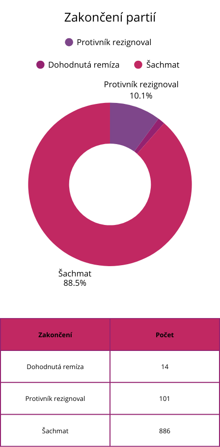 U Dobyté věže jsem strávila několik hodin sbíráním dat z 1034 odehraných šachových partiích z období 1. ledna až 21. září 2025 (jestli je vám podezřelé konečné datum, tak vězte, že mi to vyšlo na konec stránky). Z těchto všech partií jsem vyřadila ty, kdy protivník rezignoval okamžitě nebo během prvního tahu. Vypozorovala jsem totiž, že šlo většinou o lidi, kteří v doupěti čekali na jiného soupeře a mezitím jim výzvu přijal někdo, s kým nebyli domluvení. Partií mi zbylo 1001.