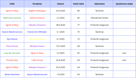 Výše uvedené ale neznamená, že by se u nás hrály jen partie mezi stejnými protivníky bez koncovky. Pojďme se podívat na opačný extrém – ty nejdelší odehrané partie v daném období. Celkem je partií nad 10 tahů 223 (22 % ze všech odehraných) a z nich 175 (78 %) skončilo šach matem a zbytek rezignací či remízou. Vůbec nejdelší úspěšně odehraná partie měla tahů 86 a sehrály ji Agnes O Mary a Angélica Rodriguez.