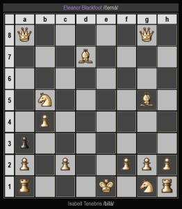 Kuriózní jsou pak situace, kdy král se hry zmizí. Stalo se tak například v partii Eleanor Blackfoot s Isabell Tenebris 24. 4. 2025. Madam Blackfoot mohla ve hře vesele pokračovat i bez něj a zastavilo ji až to, že nemohla s pěšcem táhnout dále.
