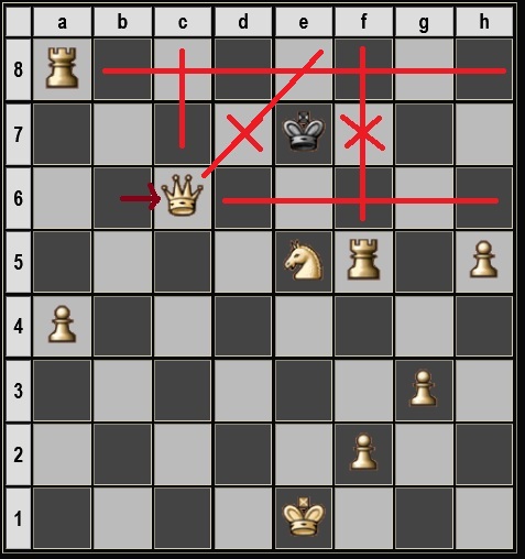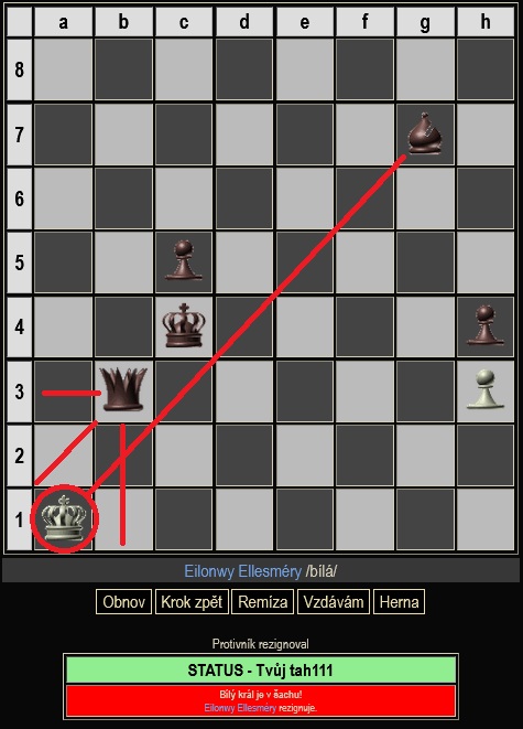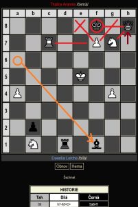 Jak vidíte na přiložené ukázce, poslední tah bílé dámy byl Db6-c6 (Dc6). Tím ovšem bílý nedal šach a černý už neměl jak hrát. V rámci zkoumaných partií jsem tuto chybu viděla mnohokrát. Snoubí se s pocitem, že k výhře je nutné sebrat soupeři co nejvíce figur a nezkušeností hráče. V okamžiku, kdy se dostanete do situace, kdy protivník hraje už jen králem (nebo opravdu málo figurami), je nutností, aby hráč s převahou hrál obezřetně a protivníka takto neuzamknul. Zde by mohlo pomoci tlačítko Krok zpět, které nicméně dlouho nefungovalo.