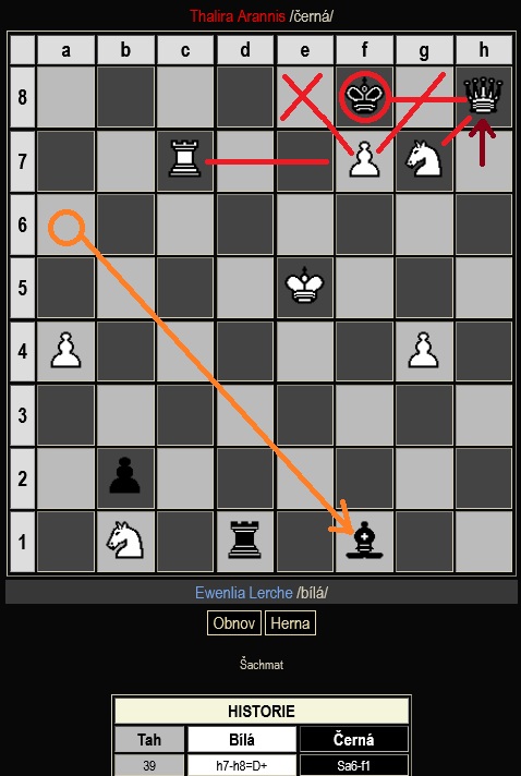 Z této chyby se ale dá vyváznout, máte-li k dispozici jinou hratelnou figuru. Jak vidíte na partii Ewenlie Lerche s Thalirou Arannis, po matu bylo nutné zahrát další tah, aby se uznal. Není to ale zdaleka ideální řešení.