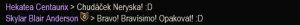 Suzzy Blackwood (kapitánka): K zápasu se ráda vyjádřím. Jako tým jsme si ho užili neskutečně, ač jsme opět doufali z různých důvodů (především mudlovských nemocí) v krátký zápas, zase nám to nevyšlo. Vzhledem k tomu, že nás bylo méně, jsme tedy postupně začali tak nějak přirozeně sbírat Záskoky, nejvíc toho pak naskákala Barb, která statečně, ač byla u mudlů na vánočním večírku, na hřišti vystřídala snad všechny pozice až na brankáře. Moc přejeme výhru Testrálům a náleží jim velká gratulace i můj obdiv. Měli velice dobrou strategii a hráli skvěle. Byla radost s nimi sdílet hřiště.