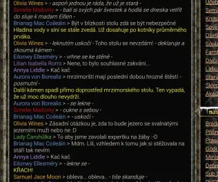 Zatímco jsem sbírala kousky svého rozbitého srdce a snažila se zachránit alespoň čokoládu, do síně se přiřítila blonďatá studentka, jejíž jméno bych vám ráda sdělila, ale než jsem stihla zaostřit, skla na brýlích mi vlivem extrémních teplot zamrzla. Pištěla, že ji pokousala její krysa, která je od rána agresivnější než obvykle. Bingo! I moje kluběnka, která je jinak mírumilovná, nebyla zrovna ve své kůži. Zrudly jí oči a věřte mi, zánět spojivek vypadá jinak. Mám s tím četné zkušenosti. Červené oči vzápětí zaznamenaly i slečny Muerte a Williams. Že by otrávené jídlo? Nějaká snaha o útok na hradní mazlíčky? Nebo snad jen špatná náhoda? Žádná náhoda. Myšlenky nám létaly hlavou sem tam asi všem, když v tom jsme zaslechli dupání a štěkot. Že by další problém?