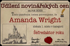 Další kategorii přišla vyhlásit slečna Ashley, ze které Rita nedokázala spustit oči, a když se přiblížila k pódiu, začala se jí vyptávat na rodiče. Havraspárská šéfredaktorka nad rodinnou situací mávla rukou, nenechala se zlákat k tlachání a začala s vyhlášením. V kategorii Článek roku 2025 bylo nominovaných 9 článků, přičemž jak slečna Ashley správně podotkla… 100 lidí 100 chutí, ale přesto bylo z čeho vybírat.