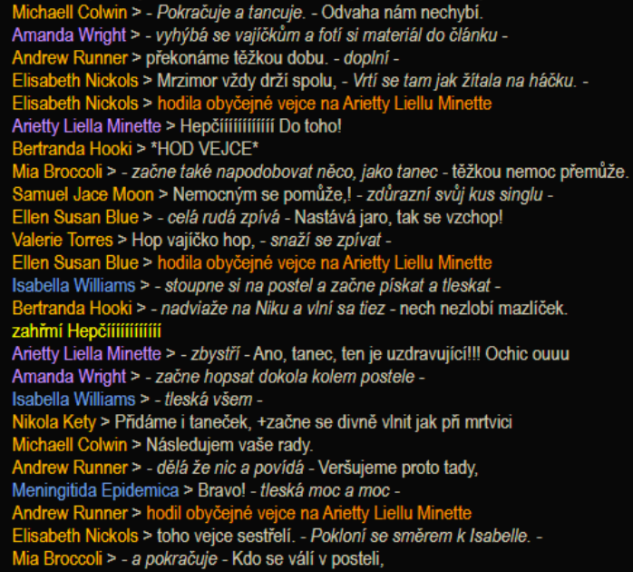 I přes obavy však žlutí nakráčeli na ošetřovnu, kde už čekalo i několik modrých podporujících duší. Já si přisedla za nebohou nemocnou do postele, slečna Enid se vybavila dokonce bubnem s paličkami a první verše zněly tichou místností, ale víte co? Setkalo se to ze strany lazarů s absolutním nefalšovaným nezájmem.