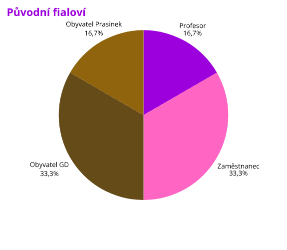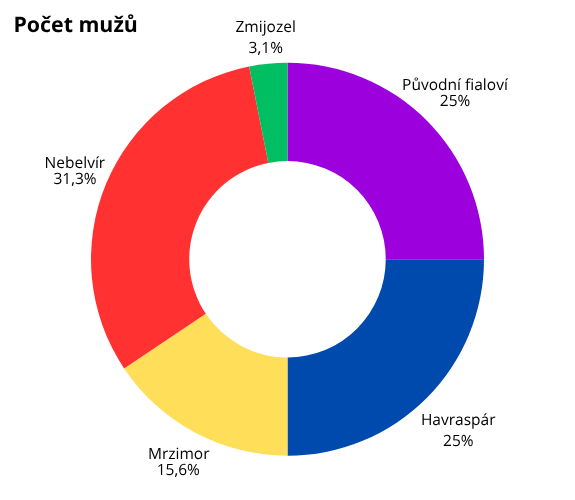 Celkově máme na hradě 98 Fialek a 32 Fialů. A kde ti fialoví muži jsou? Největší zastoupení mají ti s původem v Nebelvíru, kterých je 10. Z 12 původních fialových je rovných 8 mužského pohlaví. Chybělo málo a měli jsme 12 rozhněvaných mužů coby původní fialové! 8 mužů je původem z Havraspáru, 5 z Mrzimoru a pouze jeden ze Zmijozelu. Ferdinand asi nesnese konkurenci!