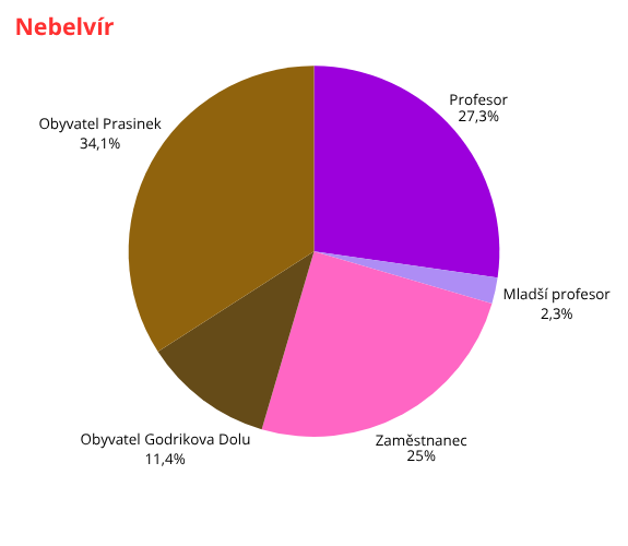 Pokud chcete konkrétní čísla, máme na hradě suverénně nejvíc obyvatel Prasinek – 45. Dále pak 34 profesorů, 30 zaměstnanců, 19 obyvatel Godrikova Dolu a 2 mladší profesory.